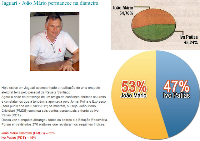 Três enquetes (Jornal A Folha, Revista Santiago e Jornal Expresso) mostraram o atual prefeito de Jaguari, João Mário Cristofari, na frente de Ivo Patias, conforme intenções de voto das pessoas entrevistadas.